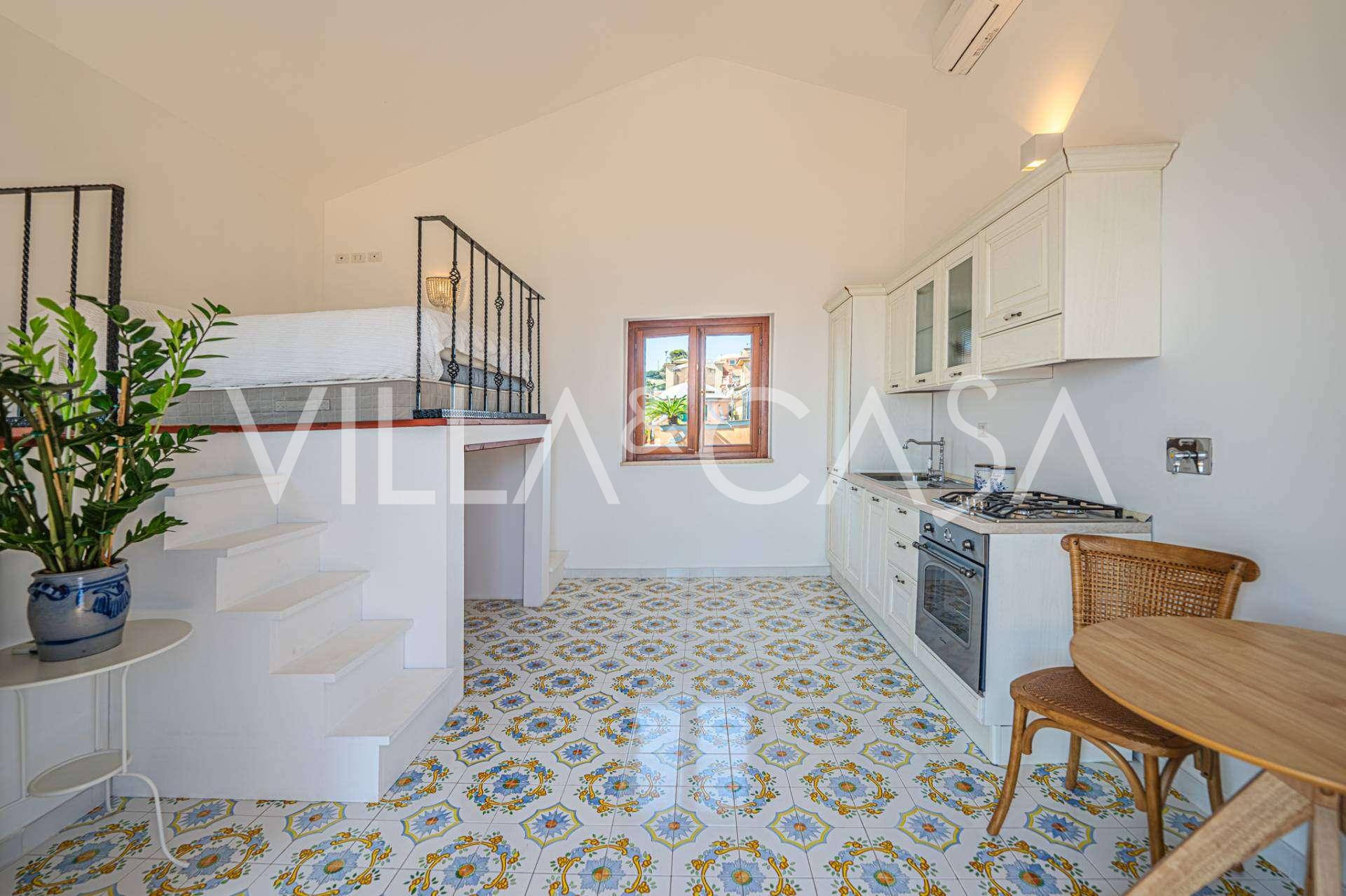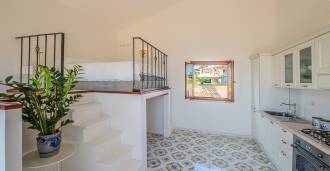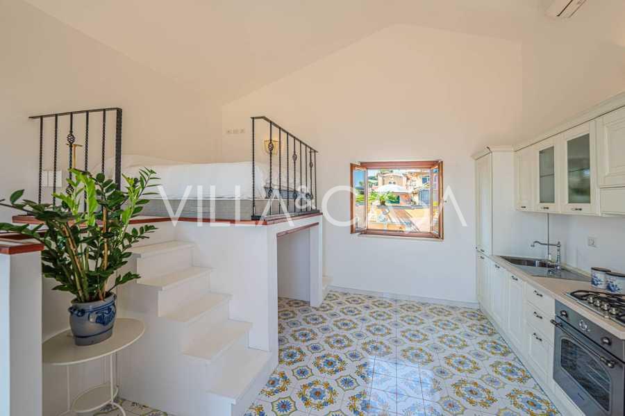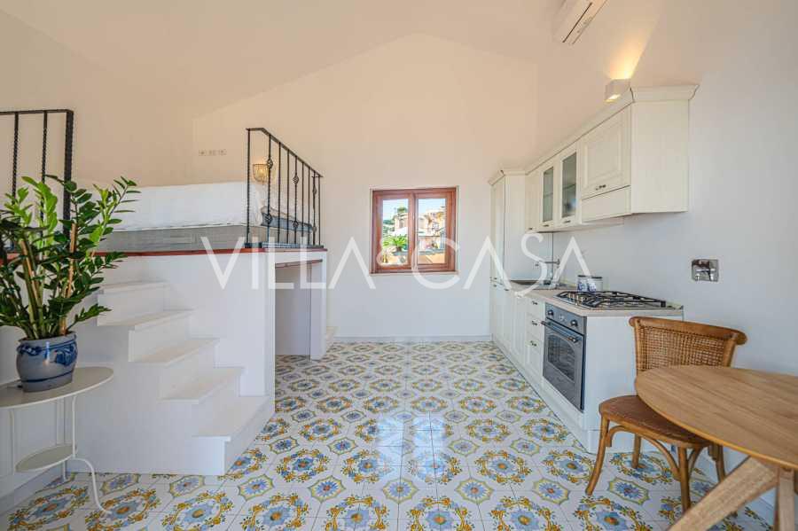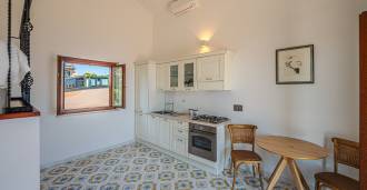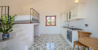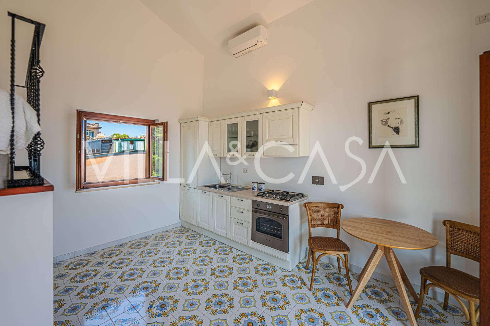 تفتح غرفة المعيشة الرئيسية، المزينة بنوافذ كبيرة، على تراس مثالي للتواصل والاستمتاع بغروب الشمس النادر. تجمع المطبخ، المصمم حسب الطلب يدويًا، بين الجماليات والوظائف، مع جزيرة مزينة بالبلاط المرسوم من بوزيتانو وأحواض نحاسية أصلية.