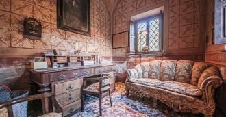 تُدهش الديكورات الداخلية للقلعة الزوار بجوها المهيب القديم: صفوف من الغرف مع مدافئ وجداريات، وقاعة قديمة مزينة بالرسم وسُلَّم أنيق يؤدي إلى الطابق العلوي حيث توجد الشقق. في الطابق الأول توجد غرف الاستقبال، ومكتب في قاعدة البرج، وغرفة طعام، ومطبخ، وحمام ضيوف، وتطل الشرفة على الحديقة.